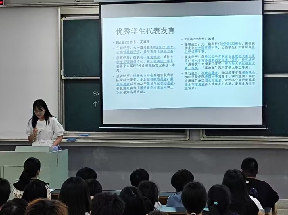 学生优秀代表D营销222班施畅和B信管221夏璐瑶结合自身经历,从知识学习和竞赛实践两个方面介绍大学生活,表达对学弟学妹的鼓励和祝福。