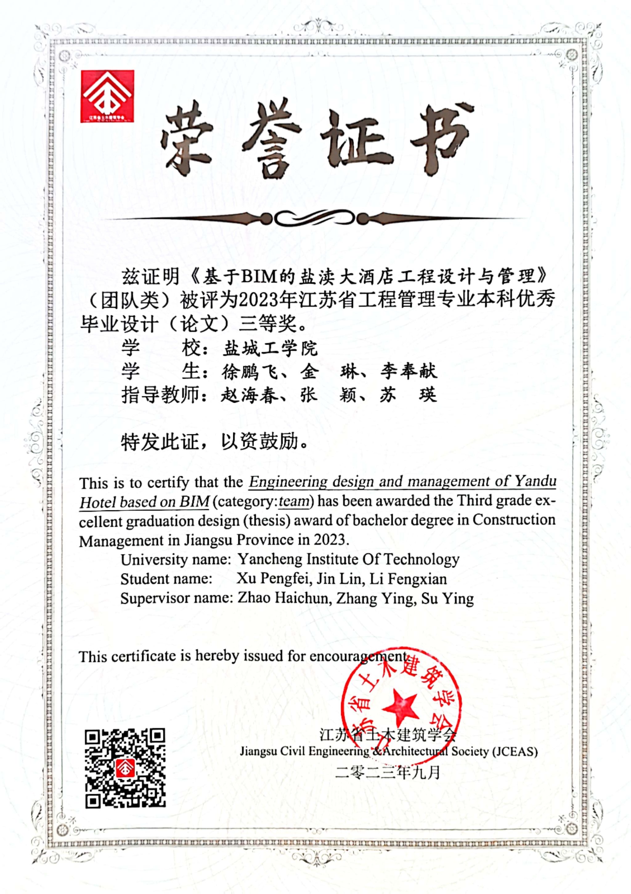 近日,江苏省土木建筑学会发布了《真人赌博游戏_澳门赌博网-app*官网:评选 2023年江苏省工程管理类专业优秀毕业设计(论文)的通知》,由土木学院赵海春、张颖、苏瑛老师指导,金琳、徐鹏飞和李奉献同学共同完成的团队毕业设计《基于BIM的盐渎大酒店工程设计与管理》荣获团队类三等奖。