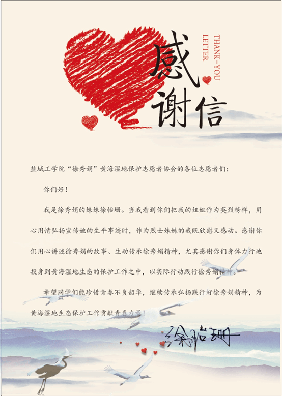 徐秀娟黄海湿地保护志愿者协会志愿者代表韦琰霖在发言中表示,作为新时代青年,将沿着徐秀娟烈士的足迹,继承和弘扬徐秀娟乐苦敬业,甘于奉献的伟大精神,坚持做徐秀娟精神宣讲者,世遗品牌宣传者,生态保护践行者,为全球湿地生态保护贡献青春力量。
