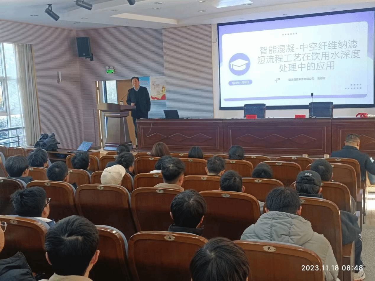 葛绍根以“智能混凝-中空纤维纳滤短流程工艺在饮用水深度处理中的应用”为题,结合城镇水务2035年行业发展目标和最新的生活饮用水卫生标准GB5749-2022,系统地介绍了里下河地理概况、水质特征以及常规净水工艺存在的问题,提出智慧化供水系统、智慧水厂是将来的发展方向。他结合该公司在技改方面取得的一些成果和荣誉以及与土木学院建立的产教融合平台情况,激励学生要努力学好专业知识,注重理论联系实际,在将来的工作中取得优异的成绩。