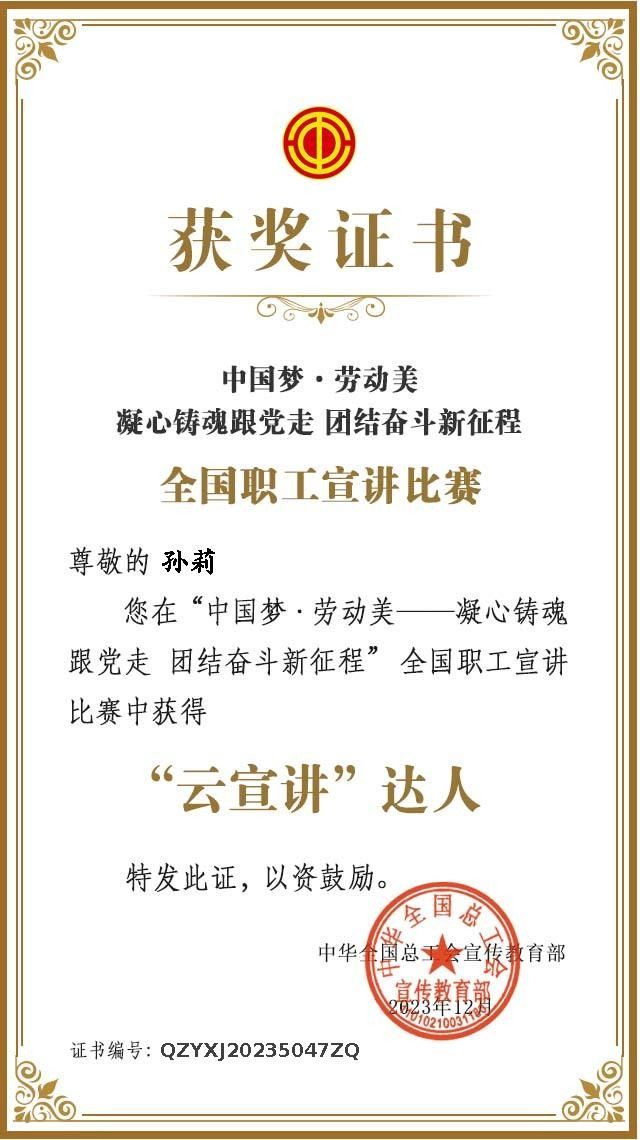 为深入学习宣传贯彻中国工会十八大精神,真人赌博游戏_澳门赌博网-app*官网工会积极组织教职工参加“中国梦·劳动美·幸福路——凝心铸魂跟党走 团结奋斗新征程”全国职工宣讲比赛,选送马克思主义学院孙莉、赵迎华、张瑞芹、张成联、蔡云晨等5位教师参赛。经过层层选拔和激烈竞争,孙莉老师荣获中华全国总工会“云宣讲”达人称号。据悉,全国获此称号的仅有1000人。