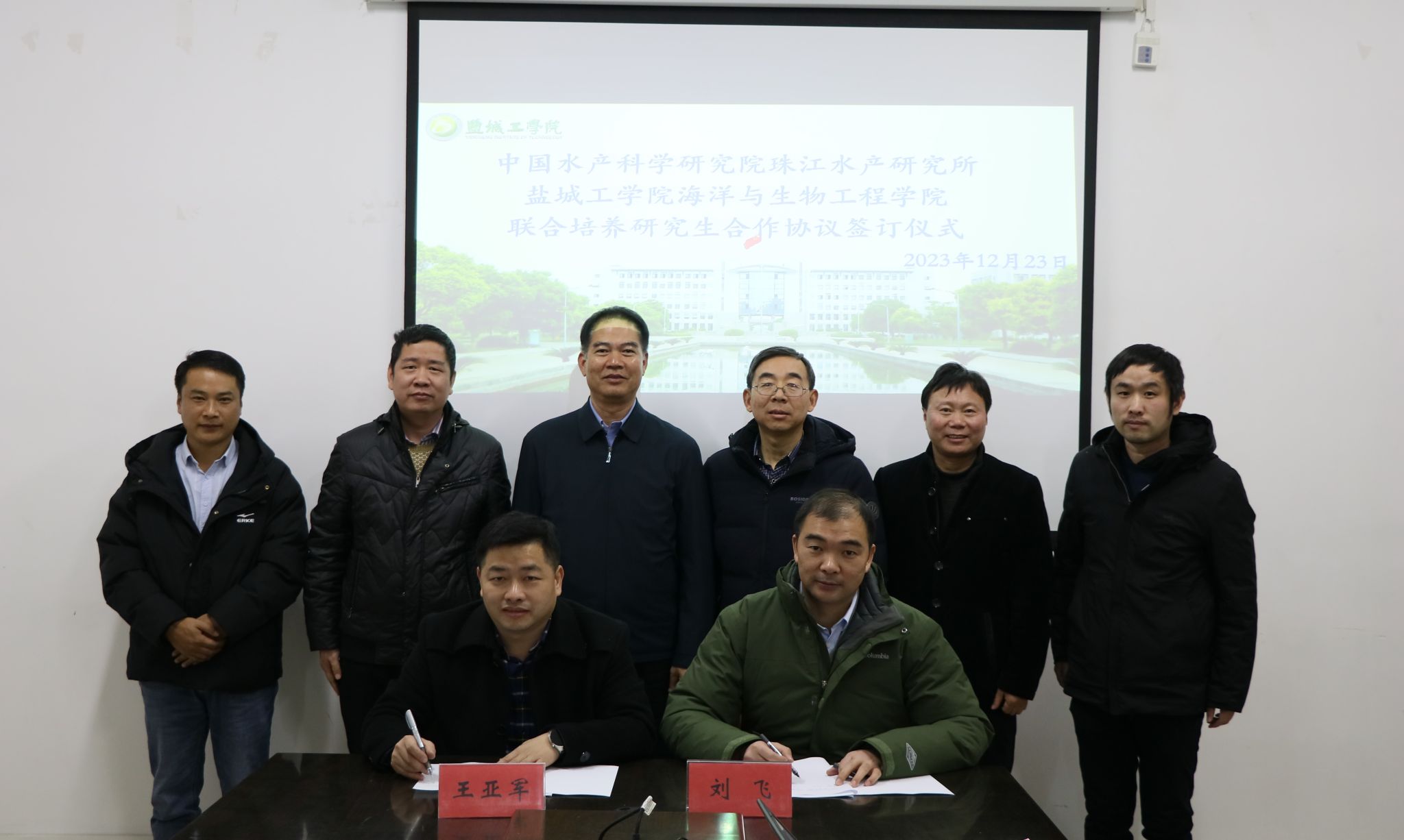 12月23日下午,海洋与生物工程学院与中国水产科学研究院珠江水产研究所联合培养研究生协议签字仪式在海生学院会议室举行。珠江水产研究所所长徐瑞永、成果处处长王亚军,海生学院院长彭斌,副院长齐志涛、刘飞等参加签约仪式。仪式由海生学院党总支书记高留才主持。