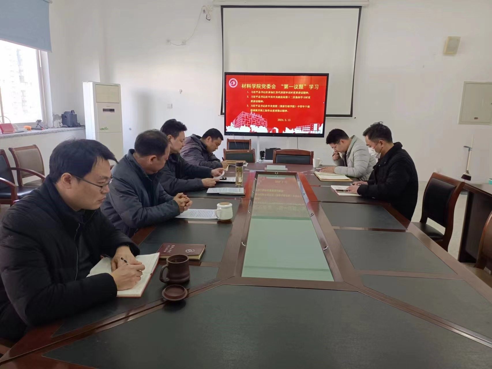 3月13日上午,在北校区知达楼B314会议室,材料学院党委会以“第一议题”形式,认真学习习近平总书记在参加江苏代表团审议时、在中共中央政治局第十二次集体学习时、在中央党校(国家行政学院)中青年干部培训班开班之际作的重要讲话重要指示精神。学院党委书记唐浩主持会议,全体党委委员参加。