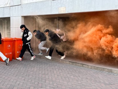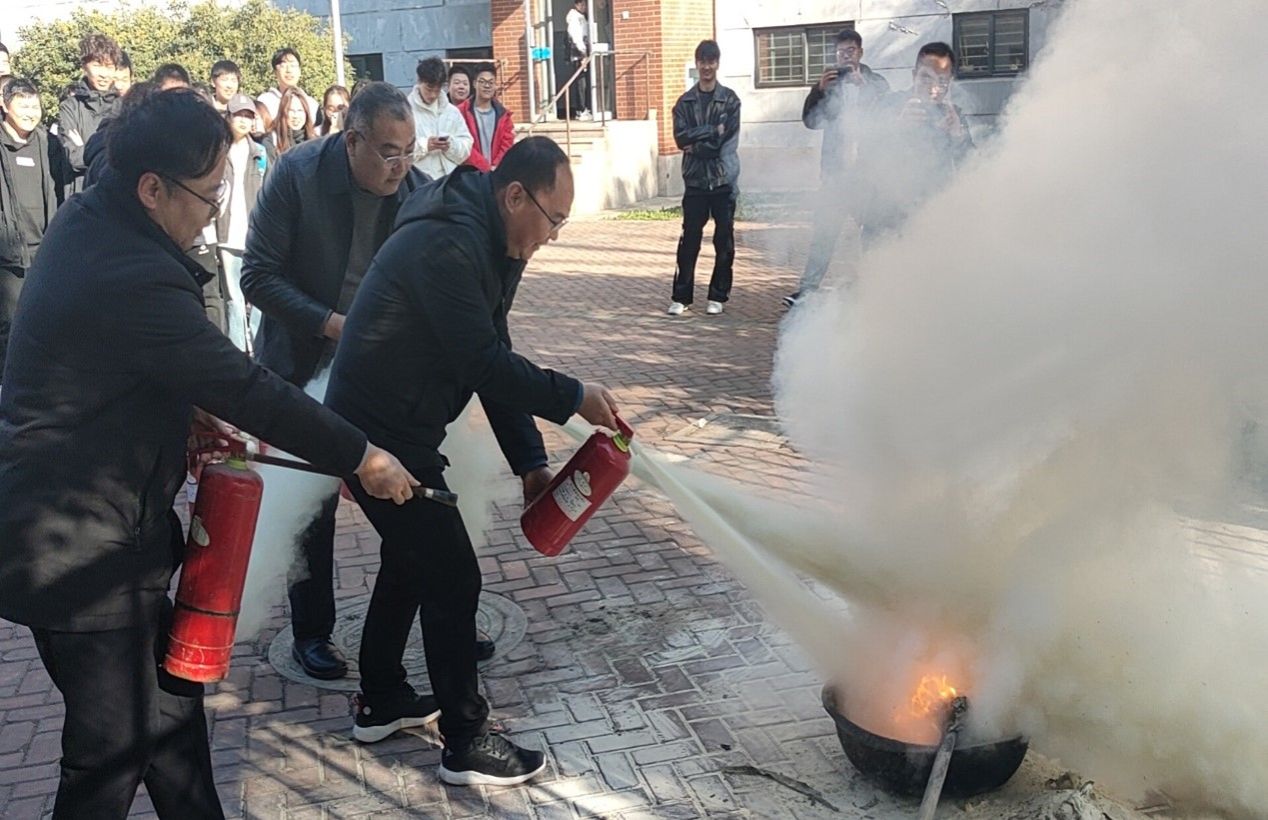 公开课结束后,全体人员在学生宿舍27号楼进行了消防实地演练。学院邀请校保卫处相关负责人员现场讲解了灭火器的构造、使用方法及注意事项等,并指导师生进行实践操作。