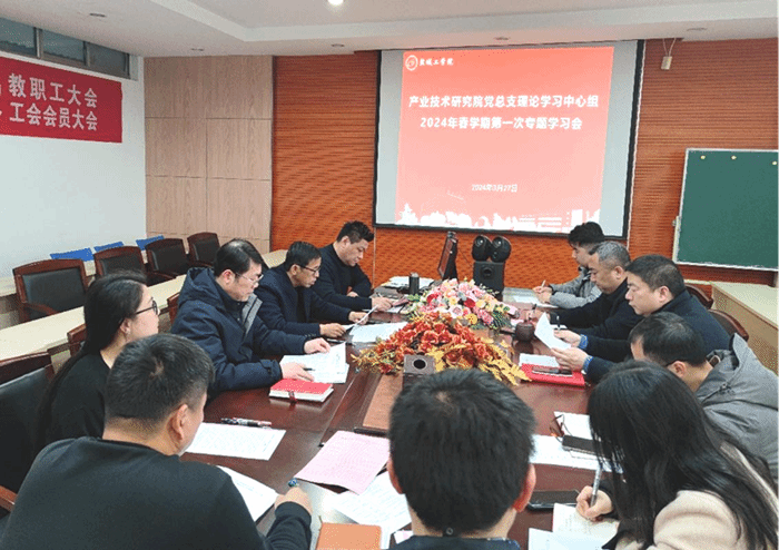 3月27日下午,在北校区知达楼AE209会议室,产业技术研究院党总支理论学习中心组举行2024年春学期第一次专题学习会。学习会由党总支书记、院长严金龙主持,院党总支理论学习中心组成员参加。