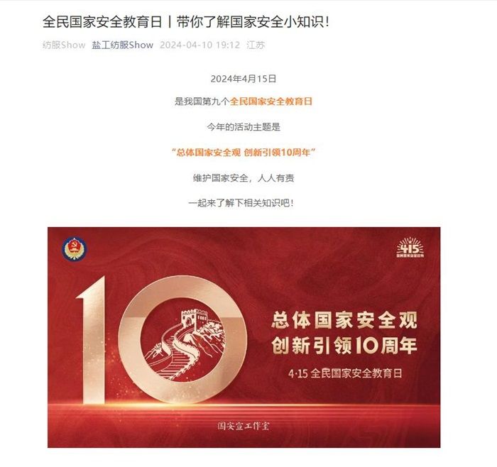 2024年是习近平总书记提出总体国家安全观的十周年,总体国家安全观是以“总体”为关键、以“十个坚持”为核心要义的科学理论体系,今年的教育活动主题为“总体国家安全观·创新引领10周年”。为了深入学习宣传党的二十大精神,贯彻总体国家安全观,坚持政治安全、人民安全、国家利益至上的有机统一,提高全体师生的国家安全意识和法治意识,努力形成尊法守法用法的良好风尚,纺织服装学院开展了全民国家安全教育日系列宣传活动。