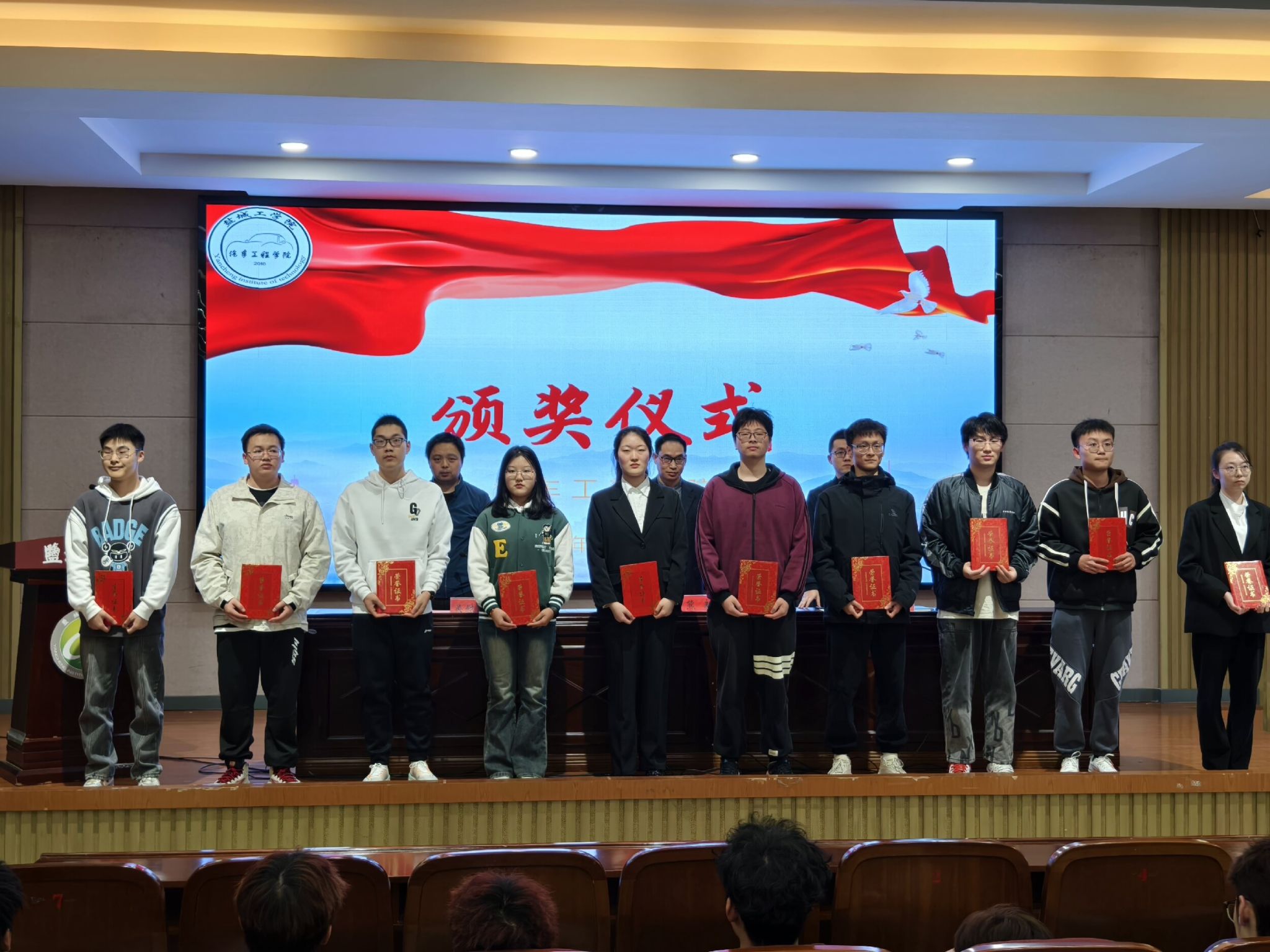 出席领导和老师为获得一等二等奖学金同学颁奖。高年级优秀学生代表B能动201班迮思亮、C车辆201班毛昕荣,B能动212班倪倩、C车辆212班张浩分享了各自在考研复习、出国留学、学科竞赛和社会实践等方面的收获和感受。2022级吴磊、杨玲、吴小瑜,2023级牛潇冉、常瑞楠、季珈羽等六名同学交流分享了学习经验与心得体会。