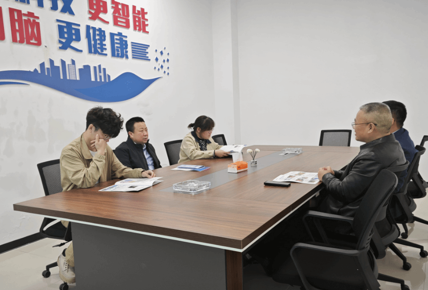 在江苏知脑健康科技有限公司,李刚向企业简要介绍了学院在人才培养方面的基本情况和取得的成绩。公司副总经理卞海涛介绍了公司的主要业务范围、未来发展规划以及人才需求情况等内容,双方围绕院企资源共享、人才共用进行了探讨。