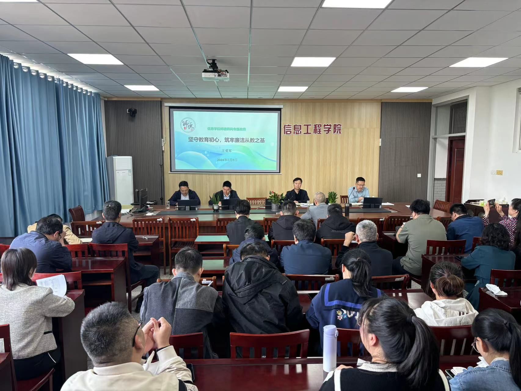 5月8日下午,信息学院在南校区怀德楼B410会议室举办以“坚守教育初心、筑牢廉洁从教之基”为主题的师德师风专题教育活动。学院党委书记王爱军主持,全院教师参加。