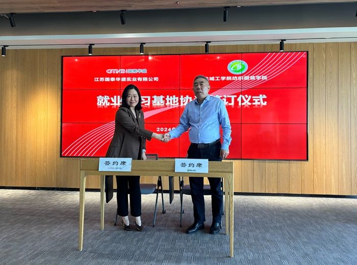 宋孝浜与江苏国泰华盛实业有限公司总经理朱荣华作为校企代表共同签订《就业实习基地共建协议》。
