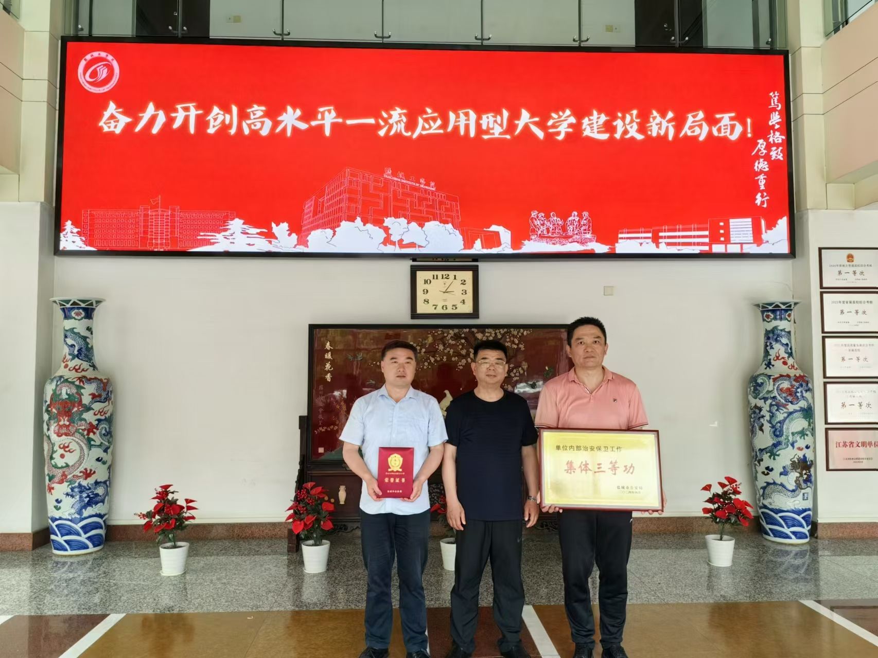 5月21日下午,盐城市公安局内保支队政委曹志宏一行来校座谈交流,并为真人赌博游戏_澳门赌博网-app*官网安全保卫处颁发2023年度单位内部治安保卫工作“集体三等功”和“先进个人”颁发奖牌和证书。安全保卫处处长张晓东、副处长林沛峰参加座谈。