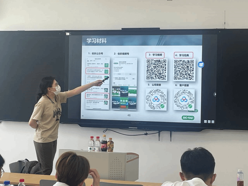 周伯扬在讲座中系统性地介绍了qPCR技术的基本原理,包括PCR扩增与检测的结合、荧光探针技术原理、qPCR的国际标准MIQE和进行仪器操作时的注意事项。通过图示和实例,她生动地阐释了qPCR技术在基因表达定量、基因型检测、病原体检测等领域的应用优势,还给同学们分享了相关学习材料,详细的Bio-Rad荧光定量PCR设备操作步骤、assay设计指南等。