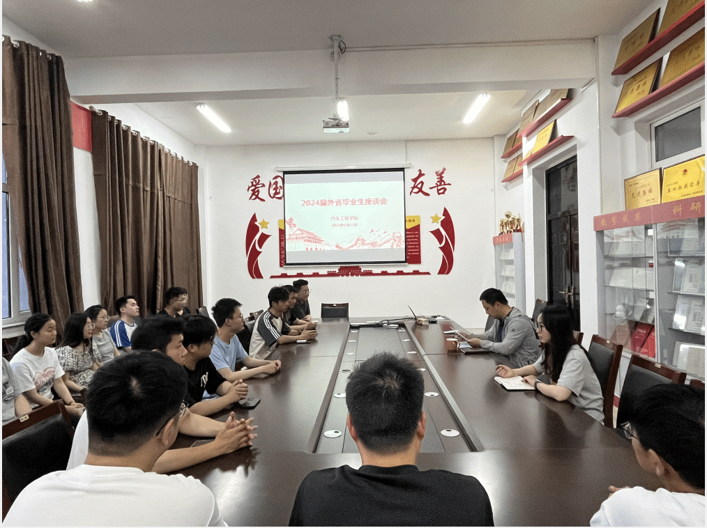 6月11日,汽车工程学院在机械馆323会议室举行了2024届毕业生代表座谈会。学院党总支副书记姜华、院长助理郑竹安、学工办主任吴慰春、毕业生辅导员孙雅以及校友联络员、外省学子、成功考取硕士研究生等40余名学生代表参加。