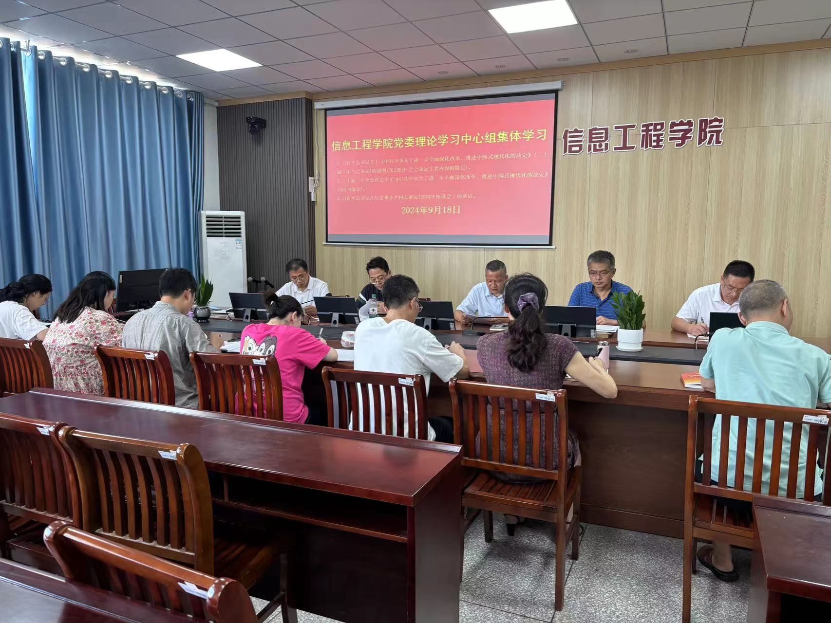 9月18日下午,信息学院党委理论学习中心组在怀德楼B410会议室举行集中学习研讨会。学习会由学院党委书记杨军主持,党委理论学习中心组全体成员参加。