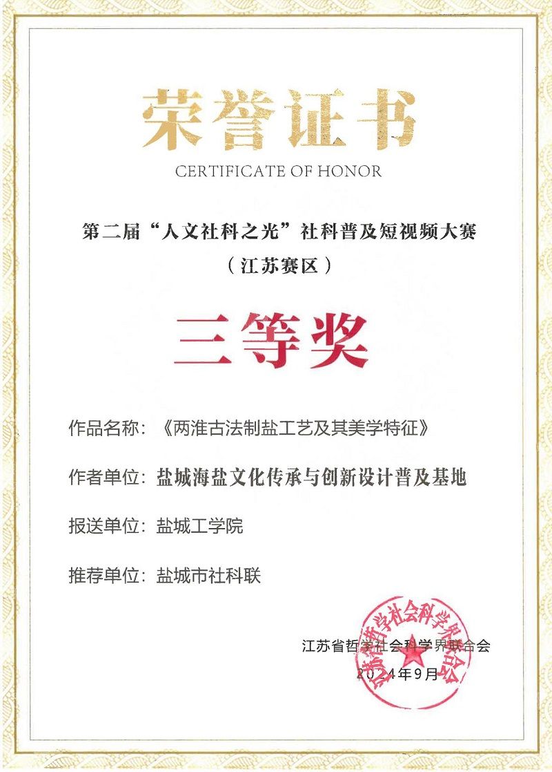 近日,由江苏省社科联主办的第二届“人文社科之光”社科普及短视频大赛落下帷幕,由真人赌博游戏_澳门赌博网-app*官网报送的设计艺术学院、盐城海盐文化传承与创新设计普及基地张军、戚凤国二位教师的作品《两淮古法制盐工艺及其美学特征》,经盐城市社科联推荐,从全省众多优秀作品中脱颖而出,荣获三等奖。该作品是真人赌博游戏_澳门赌博网-app*官网省社科普及基地建设的阶段性成果。