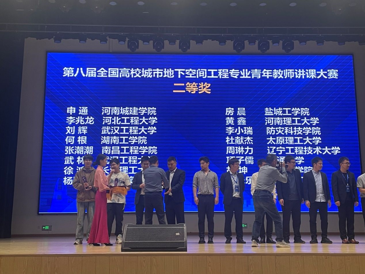 在第八届全国高校城市地下空间工程专业青年教师讲课大赛中,刘振建博士主讲的“岩石力学与工程”课程获大赛一等奖(参赛内容:三轴压缩下岩石的变形破坏特征及强度准则),房晨博士主讲的“边坡与基坑工程”课程获大赛二等奖(参赛内容:基坑降水方法及其选用)。