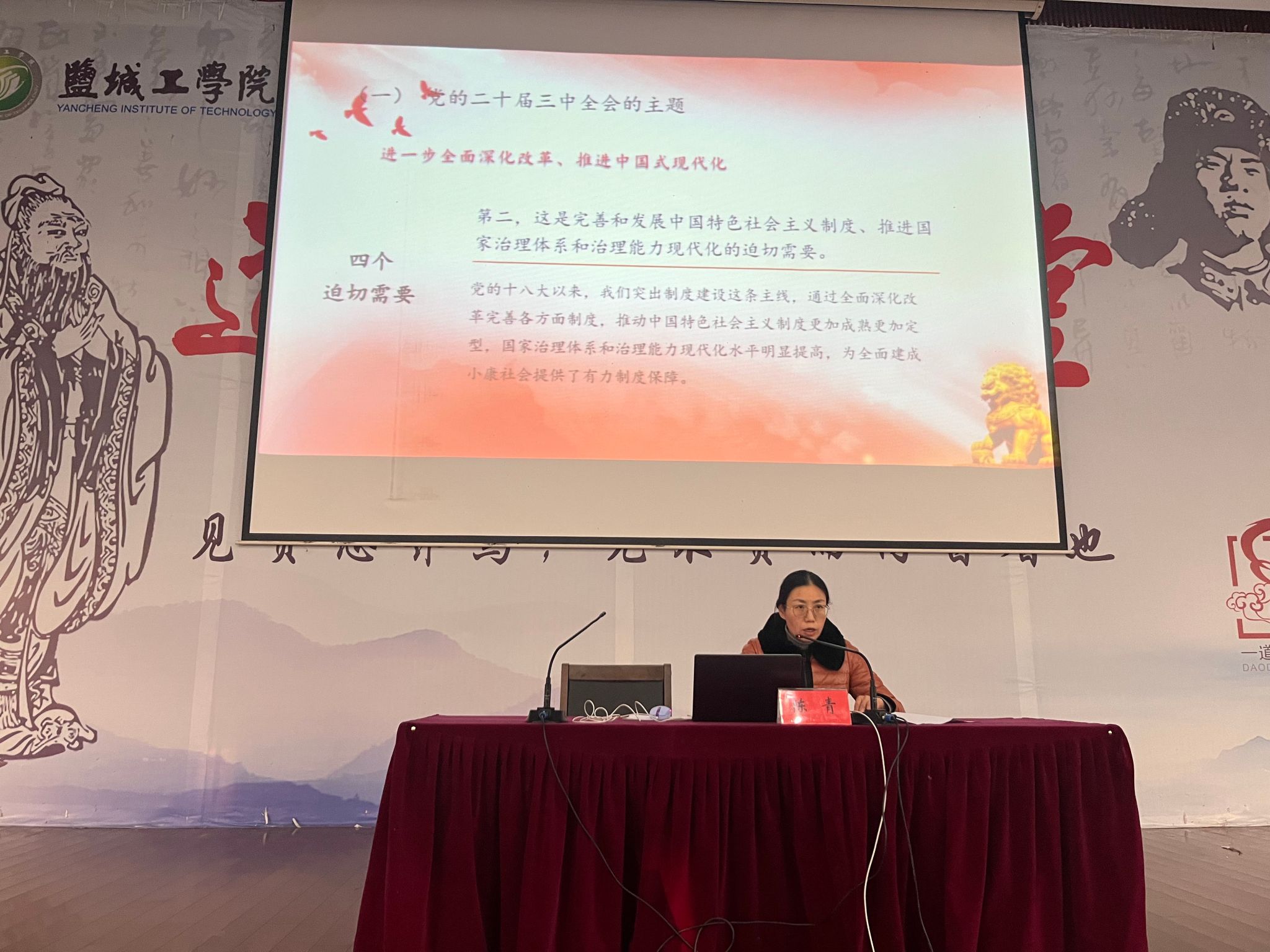 为帮助学生更好理解党的二十届三中全会的重大意义、精神实质和实践要求,进一步激发青年团员的爱国情怀和奋斗精神,12月30日下午,汽车工程学院在南校区五四报告厅举办“凝聚青春力量,谱写奋斗华章——学习党的二十届三中全会精神”主题团课,学院党总支书记陈青主讲,学院团委副书记姚源主持,学院全体团员、“菁英班”学生参加。