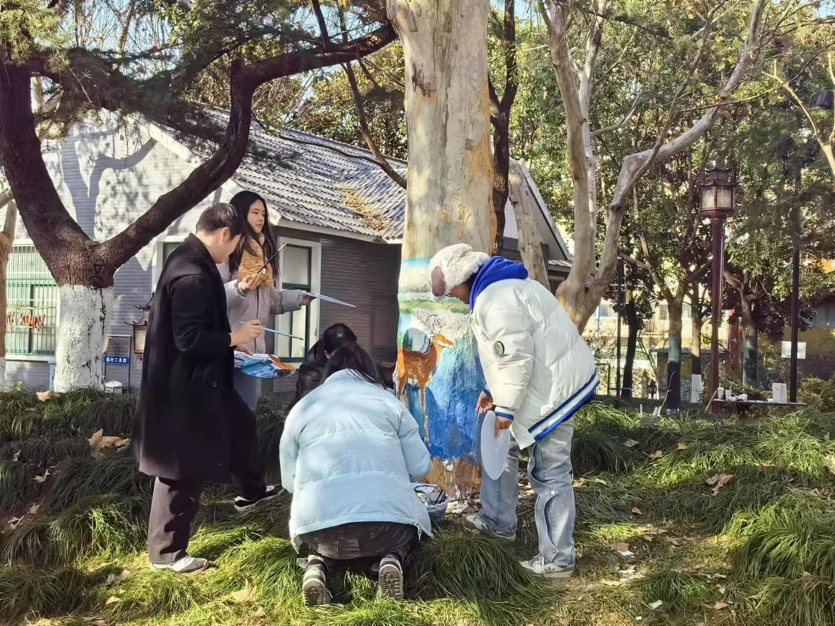 学院师生严格遵循市园林绿化管理处制定的树洞修复科学流程,深入了解树洞密封和伤口愈合剂的使用情况,并结合树木的实际状况进行从点到面的设计美化及片区更新。在此基础上,同学们用环保颜料在修复后的树木上绘制出一只只栩栩如生的小动物和一幅幅引人入胜的湿地画面,成为公园中一道独特的风景线。这一活动不时的吸引了游园市民驻足欣赏,并赢得了他们的称赞。树木修复的成果也得到了各方的一致好评。