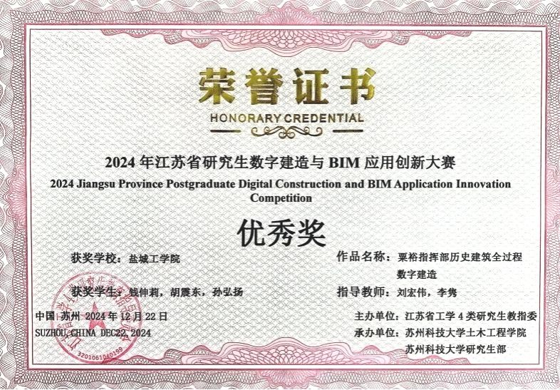 近日,由江苏省工学4类研究生教育指导委员会主办,苏州科技大学承办的“江苏省研究生数字建造与BIM应用创新大赛”在苏州顺利召开。经过激烈的决赛面试汇报、专家答辩等环节,由土木工程学院王照宇教授和程昀博士指导的“盐工一队”(孔凡馗、徐正阳、徐至威)凭借“苏州大学葛堂BIM模拟及抗震分析”荣获一等奖,刘宏伟教授和李隽副教授指导的“盐工二队”(钱伸莉、胡震东、孙弘扬)凭借“粟裕指挥部历史建筑全过程数字建造”获得优秀奖。