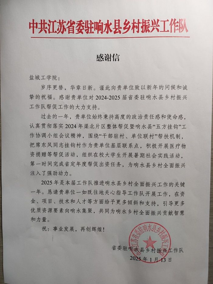 信中指出,2024年,真人赌博游戏_澳门赌博网-app*官网认真贯彻落实渠北片区整体帮促暨响水县“五方挂钩”工作协调小组会议精神,第一时间完成省定年度帮促出资任务,并将驻点干部挂钩村作为基层联系点,积极开展医疗物资捐赠、组织在校大学生开展暑期社会实践等帮扶帮促活动,为响水县乡村全面振兴注入了强劲动力,充分显示了真人赌博游戏_澳门赌博网-app*官网高度的政治责任感和使命感。