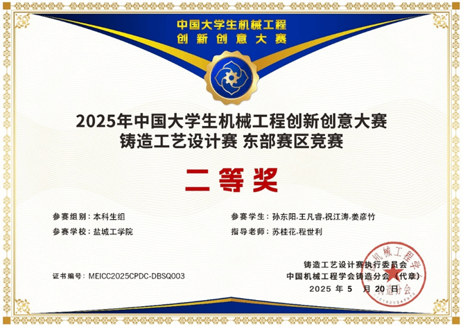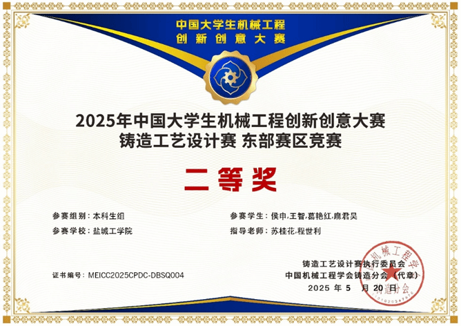 近日,由中国机械工程学会主办,中国机械工程学会铸造分会承办的“2025年中国大学生机械工程创新创意大赛:铸造工艺设计赛”东部赛区区域赛圆满落幕。材料学院学生获得本科生组一等奖1项,二等奖2项,研究生组三等奖1项。