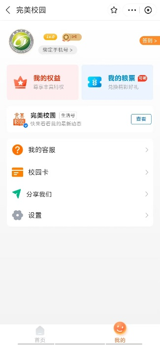 步骤二:点击进入上图“完美校园”小程序,按提示进行校园卡绑定(如进入时显示已绑定,出于安全验证需要,请解绑后重新绑定)