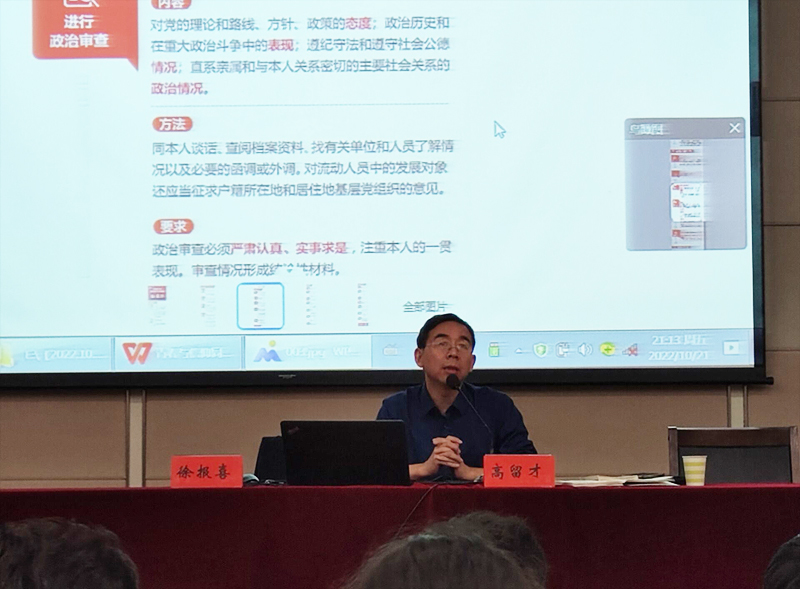 高留才为新生从入党申请、入党积极分子的确定和培养教育、发展对象的确定和考察、预备党员的接收、预备党员的教育考察和转正等方面详细讲解了入党流程,分析了青年大学生入党动机,介绍了在高校发展党员的基本条件、入党申请书及志愿书的格式要求。他要求大学生主动学习党章,学习党的基本理论,树立为共产主义事业奋斗终身的信念,种下为人民服务的火苗,自觉主动向党组织靠拢,接受党组织的考验。