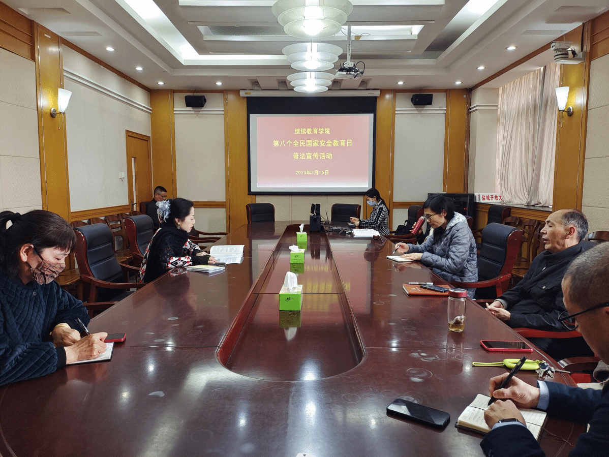为深入学习宣传贯彻党的二十大精神,贯彻落实习近平总书记真人赌博游戏_澳门赌博网-app*官网:全面加强国家安全教育的重要指示精神,增强教职工国家安全意识和法治意识,4月12日下午,在北校区图书馆301会议室,继续教育学院组织开展第八个全民国家安全教育日普法宣传活动。活动由副院长李晓燕主持,全体在编人员参加。