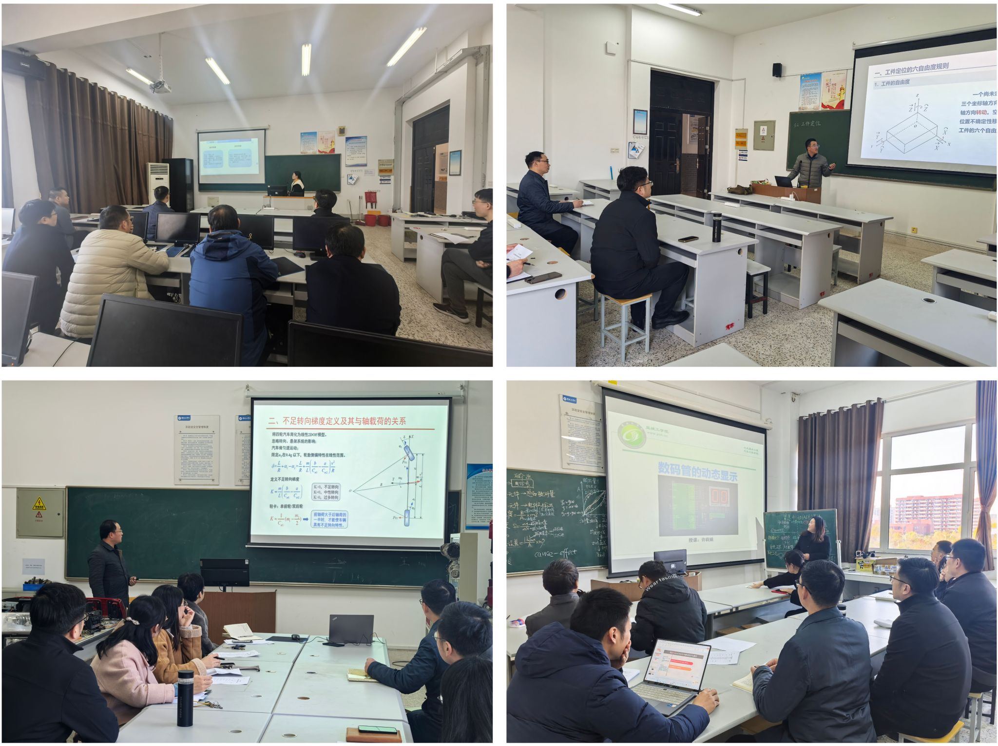 会后,刘玮与熊新参加了学院四个专业系的教学示范课活动。能源与动力工程专业易婷老师分享教学竞赛经验,并进行竞赛试讲汇报;新能源汽车工程专业刘基冈老师做工件定位及其加工工艺基准的试讲;车辆工程专业吕红明老师、孙婷婷老师等就各自的教学竞赛试讲内容作汇报;汽车服务工程专业许莉娟老师、陆萍老师等开展数码管的动态显示等知识点的教学示范。