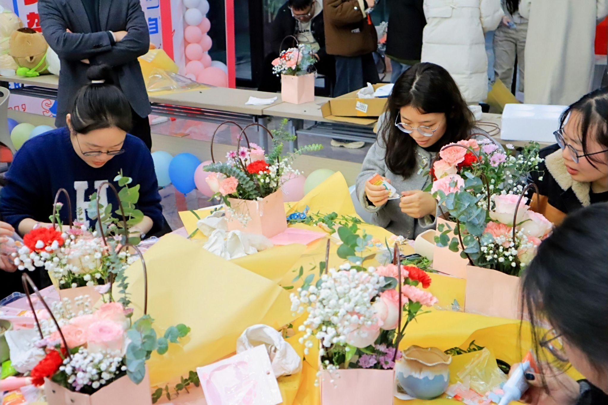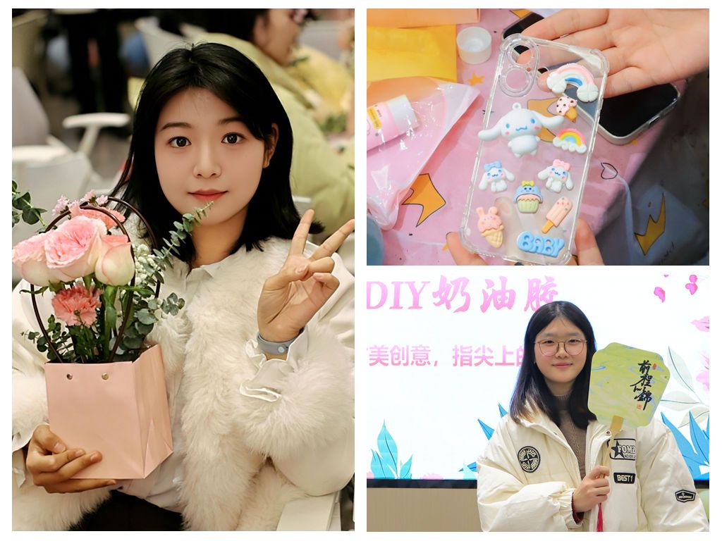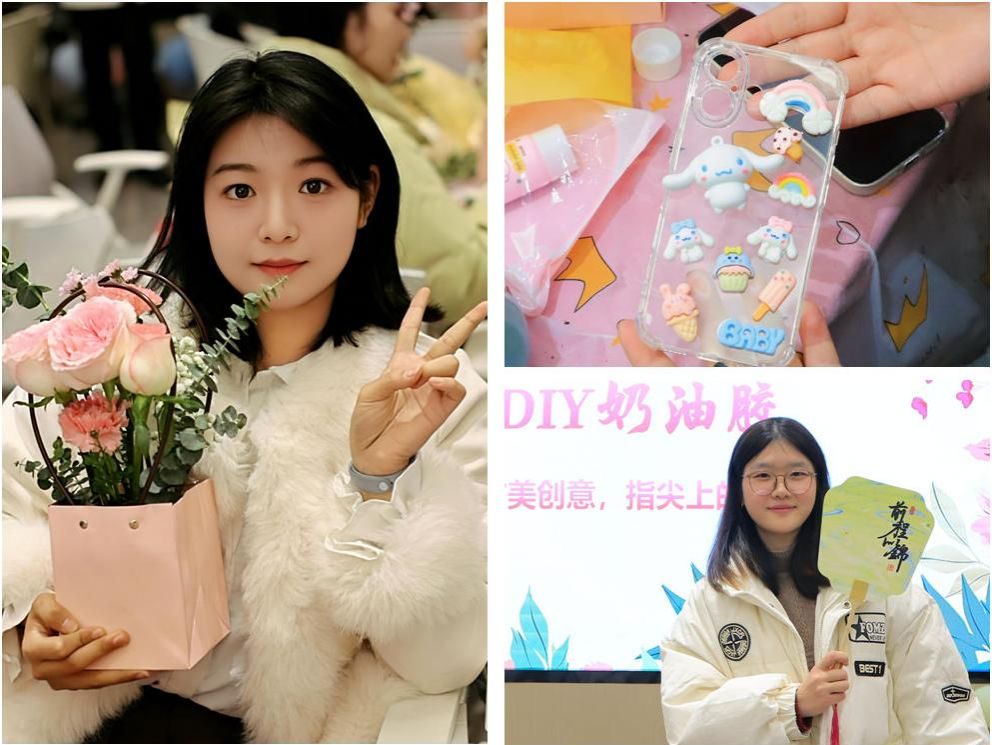 活动现场以“美育浸润心灵,运动激扬青春”为主线,精心设置两大板块,分为创意手工DIY+文娱闯关。在创意手工DIY板块中,首先是插花艺术——“研途绽芳华,巧手绘春光”,同学们无论从花材选择、色彩搭配再到造型设计都进行创意构思,每个花束都象征花信女子的青春热情和独立自由;接着是DIY节日礼物——“甜美创意,指尖上的艺术”,大家自己挑选手机壳、镜子、发夹、团扇等礼物进行DIY制作,享受女生节的欢乐和祝福。在文娱闯关板块中,双花跳绳——“花信跃动一起行”,同学们绳速如飞、技巧高超展现了各种精彩的花样动作,赢得阵阵掌声;你画我猜——“哑口无言夺冠军”,同学们用肢体语言传递各种词组形象信息,现场欢声笑语,其乐融融。